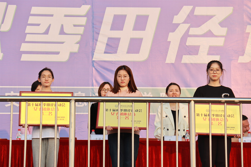 宋小秋首先宣布了获得本次“体育道德风尚奖”的团队名单,分别是计算机与软件工程学院、电气与电子工程学院、艺术设计学院、通识教育与外国语学院;获得教职工运动会优秀组织奖的是电气与电子工程学院分工会、管理工程学院分工会、艺术设计学院分工会、通识教育与外国语学院分工会。接着李佳莉老师宣布了学生团体总分、学生男子团体总分、学生女子团体总分、教职工团体总分前三名的名单。学生团体总分前三名为机械工程学院、管理工程学院、大数据与人工智能学院;学生男子团体总分前三名为机械工程学院、计算机与软件工程学院、大数据与人工智能学院;学生女子团体总分前三名为管理工程学院、艺术设计学院、大数据与人工智能学院;教职工团体总分前三名为机关分工会、计算机与软件工程学院分工会、机械工程学院分工会。随后出席闭幕式的学校领导为获奖学院和单位代表颁奖并合影留念。