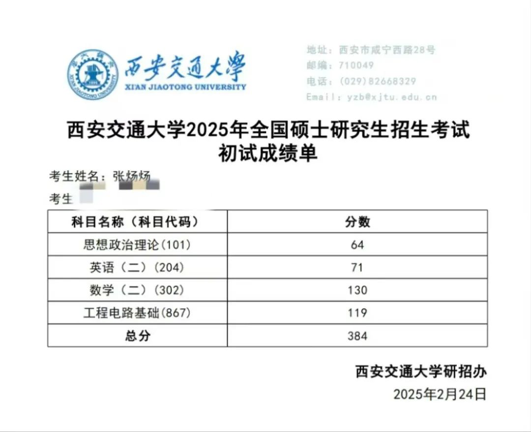 最终,张炀炀以384分,成功通过初试。