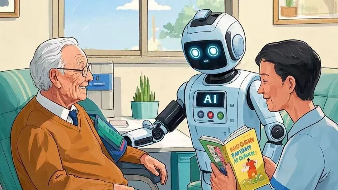幻想一下未来的养老院中,有AI机器人监测老人身体的各项指标,而人类志愿者会握着他们的手,看他们的旧照片、听他们的人生故事;
