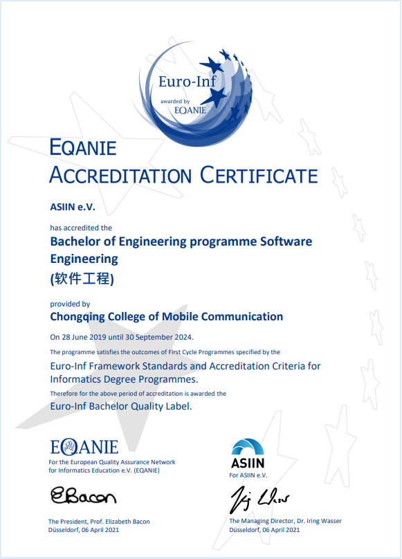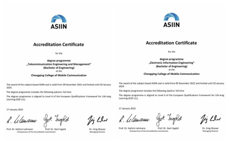 近年来,学校引进德国专业认证,加快专业内涵建设,“通信工程”“物联网工程”“软件工程”和“电气工程及其自动化”等6个专业已通过德国学科专业认证协会的认证体系(ASIIN认证),对照认证的标准规范,推进符合国际工程教育的人才培养、师资建设、课程建设和质量保障,全方位开展中德合作办学专业内涵建设和课程建设。学校“大数据管理与应用”“数字经济”“工商管理”3个专业成功通过德国ZEvA专业认证,学校成为国内应用技术大学领域中率先获得此项殊荣的院校之一。