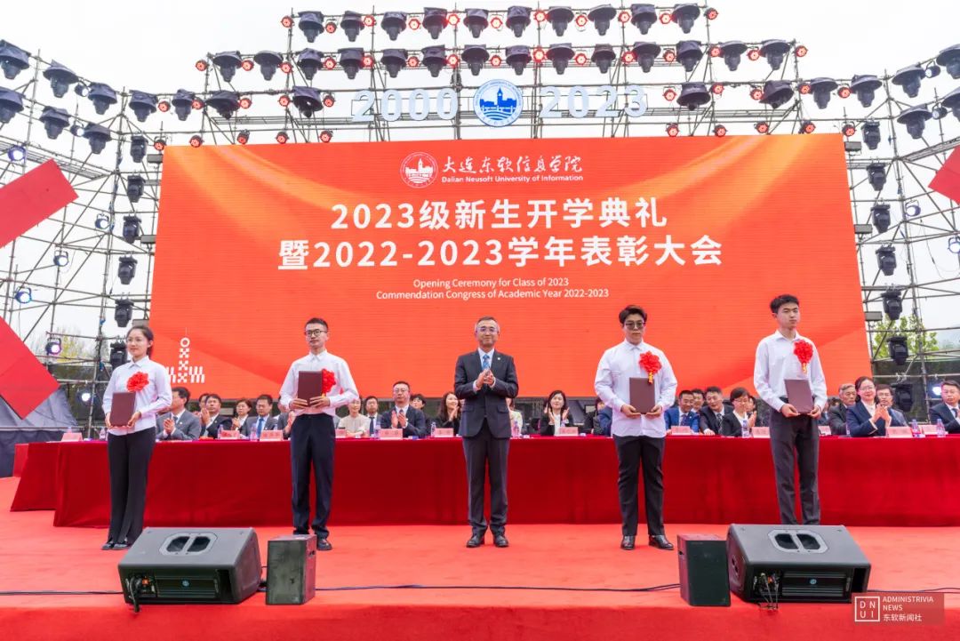 校长郭权为2022-2023学年华天奖学金获得者颁发荣誉证书(图源东软新闻社)