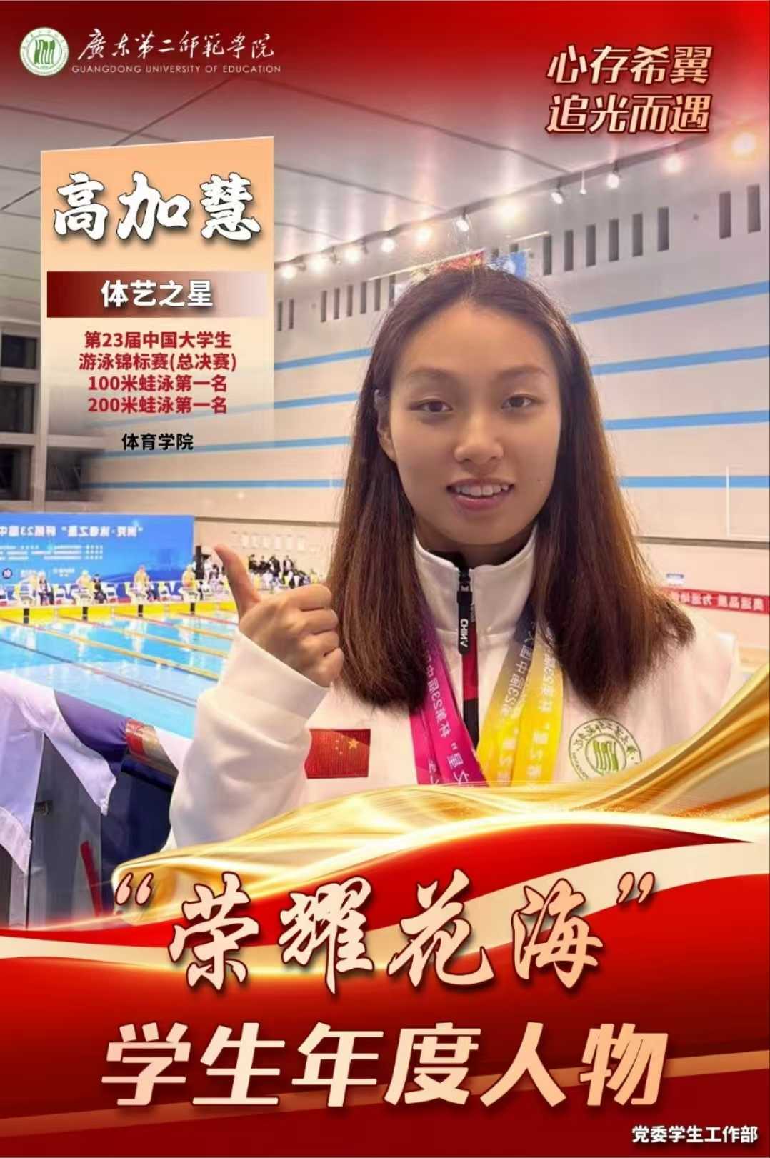 在广东第二师范学院的校园里,有一位闪耀的体育之星,她就是大三社会体育指导与管理专业的高加慧。在校期间,她担任学校水上协会会长,并于2024年12 月光荣成为中共预备党员。凭借对游泳运动的热爱与执着,她在训练与比赛中不断突破自我,展现出卓越的竞技实力。