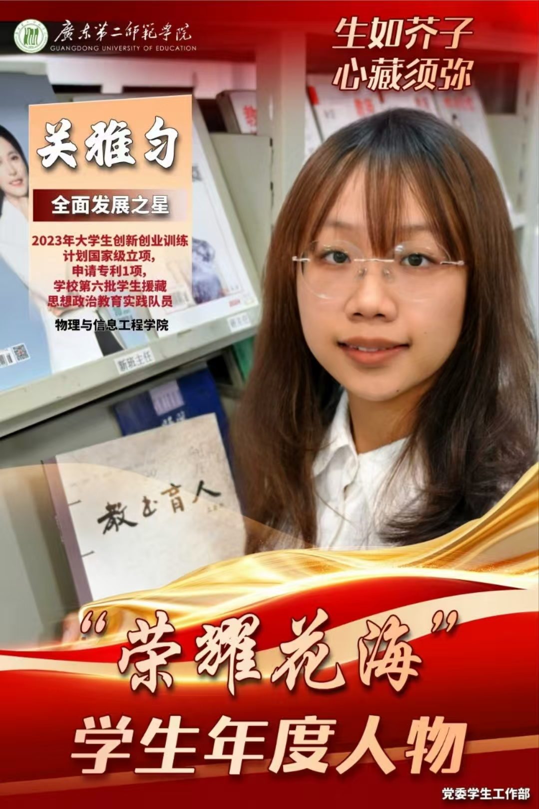 她勤学好问,善于思考,始终保持着高度的热情与严谨的态度。成绩连续三年稳居班级前列,多次荣获“优秀学生一等奖学金”及“国家奖学金”。她不仅在专业知识上精益求精,更在教学上不断探索与创新,荣获第十四届格致杯全国物理师范生技能比赛二等奖、广东省师范生技能大赛二等奖,为成为一名优秀的物理教师打下了坚实的基础。
