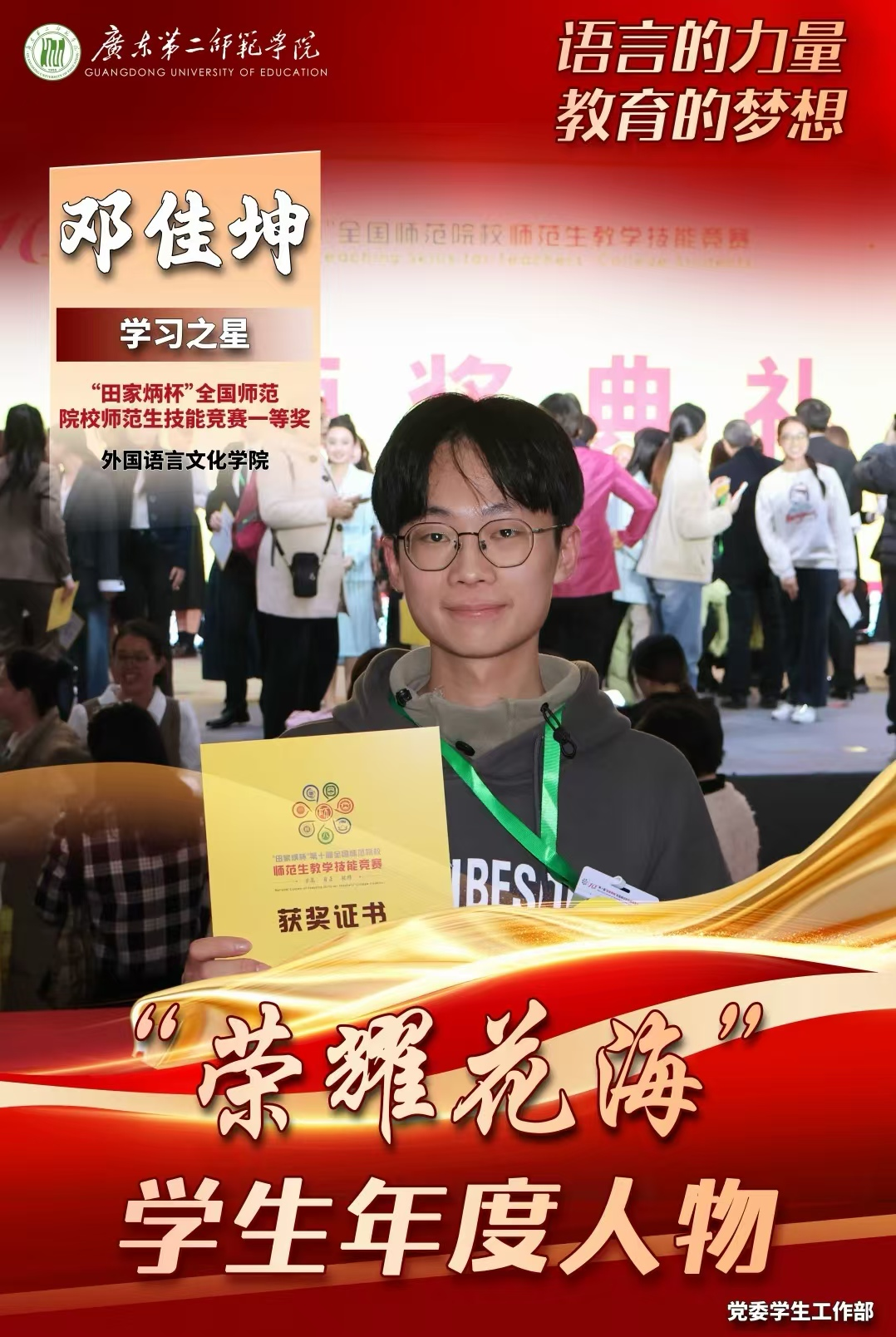 作为一名师范生,他致力于成为一名优秀的英语教师,并为之不懈奋斗。在学科教学技能、教学法等课程中,他积极配合老师的课堂互动、志愿展示自己的教学设计、与老师探讨课例和教学理论。同时,他延续以赛促学的方式,在大三通过学院师范生集训营面试,进行广东省师范生技能大赛的备赛,并在2024年9月入围决赛荣获二等奖。他继续参加第十届“田家炳杯”全国师范院校师范生技能竞赛,并荣获全国一等奖(排名第4)。除了竞赛,他也在一次次实践中磨练教学技能:他在实习学校把握机会,累计授课二十余节,听取多方意见后不断精进。