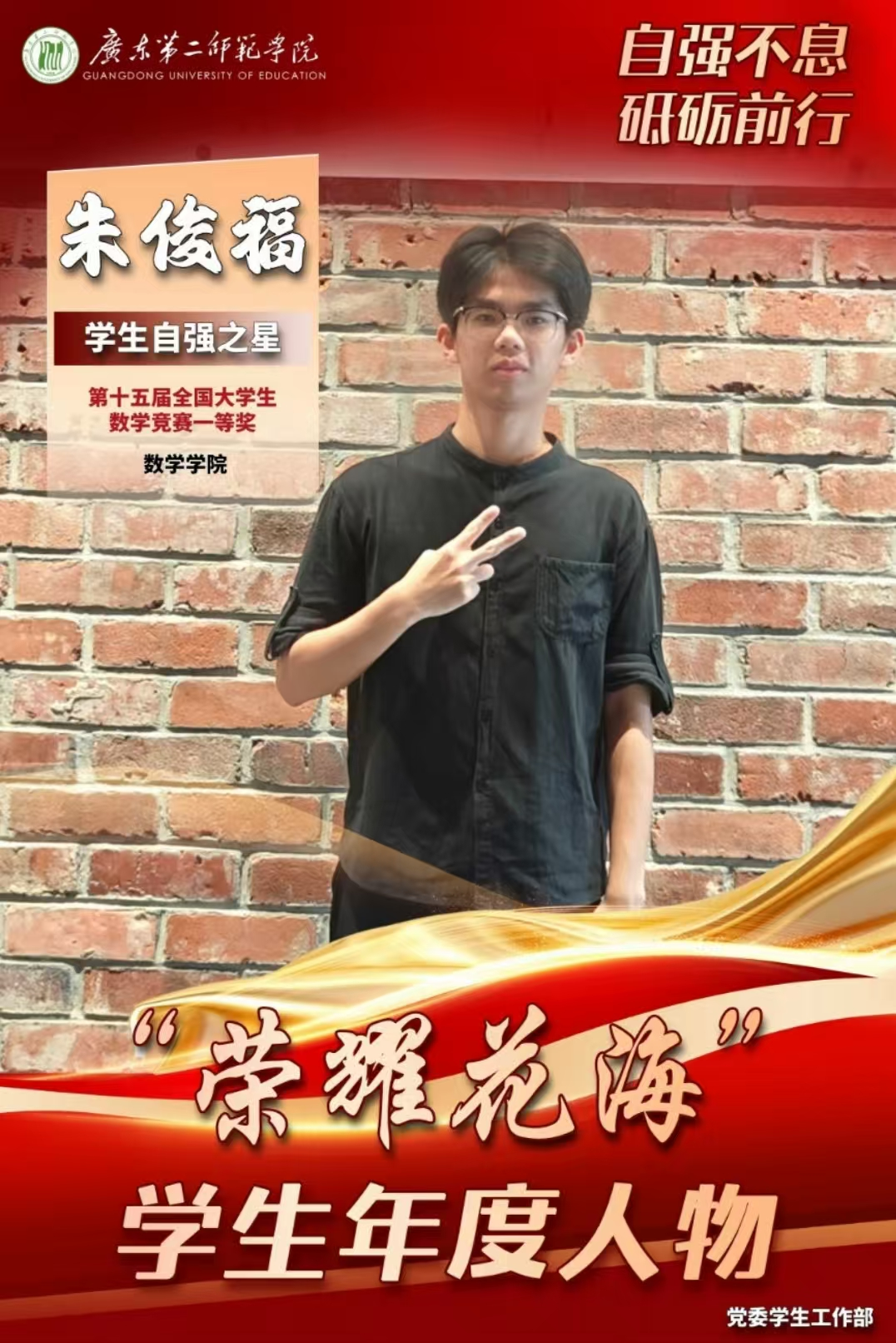朱俊福始终保持端正的学习态度,刻苦钻研专业知识。专业成绩前5%,其中均分90以上共49门,上学年平均绩点4.16,综测94.2分;本学年平均绩点4.19。曾获国家励志奖学金2次、一等奖学金、二等奖学金等荣誉。此外,他还积极参加各类学科竞赛和科研项目,荣获第十五届数学竞赛一等奖、2024年度攀登计划省级重点立项等。