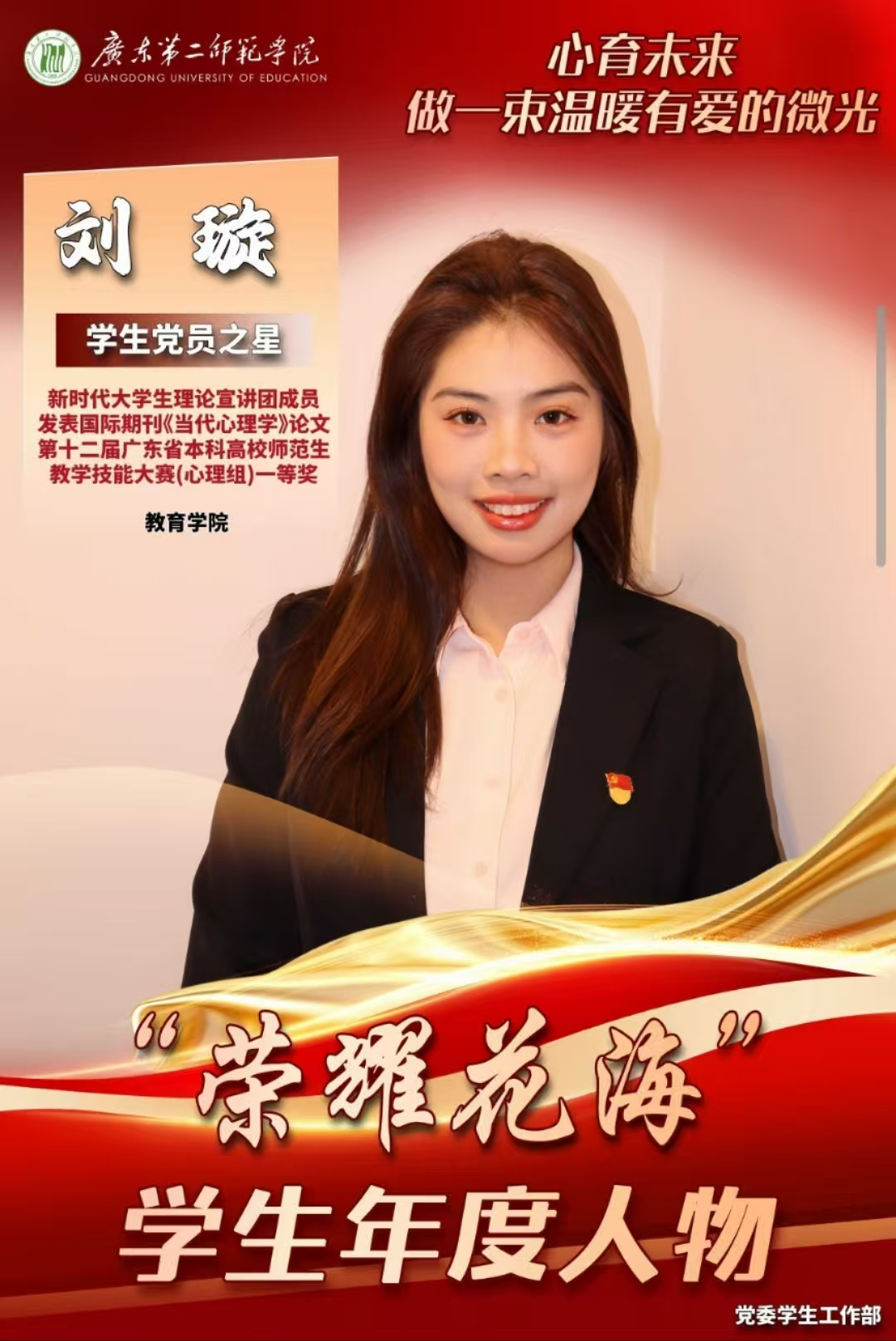 作为一名心理学师范生,她怀揣着对专业的热爱与追求,分别深入三所单位开启实习之旅。在省实实习期间,她不断提升教学、咨询、测评和干预技术,原创课堂被师生评选为年度最受欢迎心理课;在咨询公司中,她在专业咨询师的指导下,参与各类案例研讨与实操,不断精进咨询技巧;在东山医院,她对心理疾病的诊断与治疗有了更直观且深刻的认识。通过在这些与心理学紧密相连的不同就业领域中的沉浸式学习,她全方位提升了专业技能。爱国爱校,热心服务。作为二师学子,刘璇注重德法兼修,在普法教育活动中获评了积极分子和优秀心得的称号。此外,她还热衷于将温暖与关怀传递到到需要的人中去。志愿服务对象涵盖退伍军人、困境儿童和残疾学生等,活动更是受到了人民日报、金羊网等网络媒体的宣传。