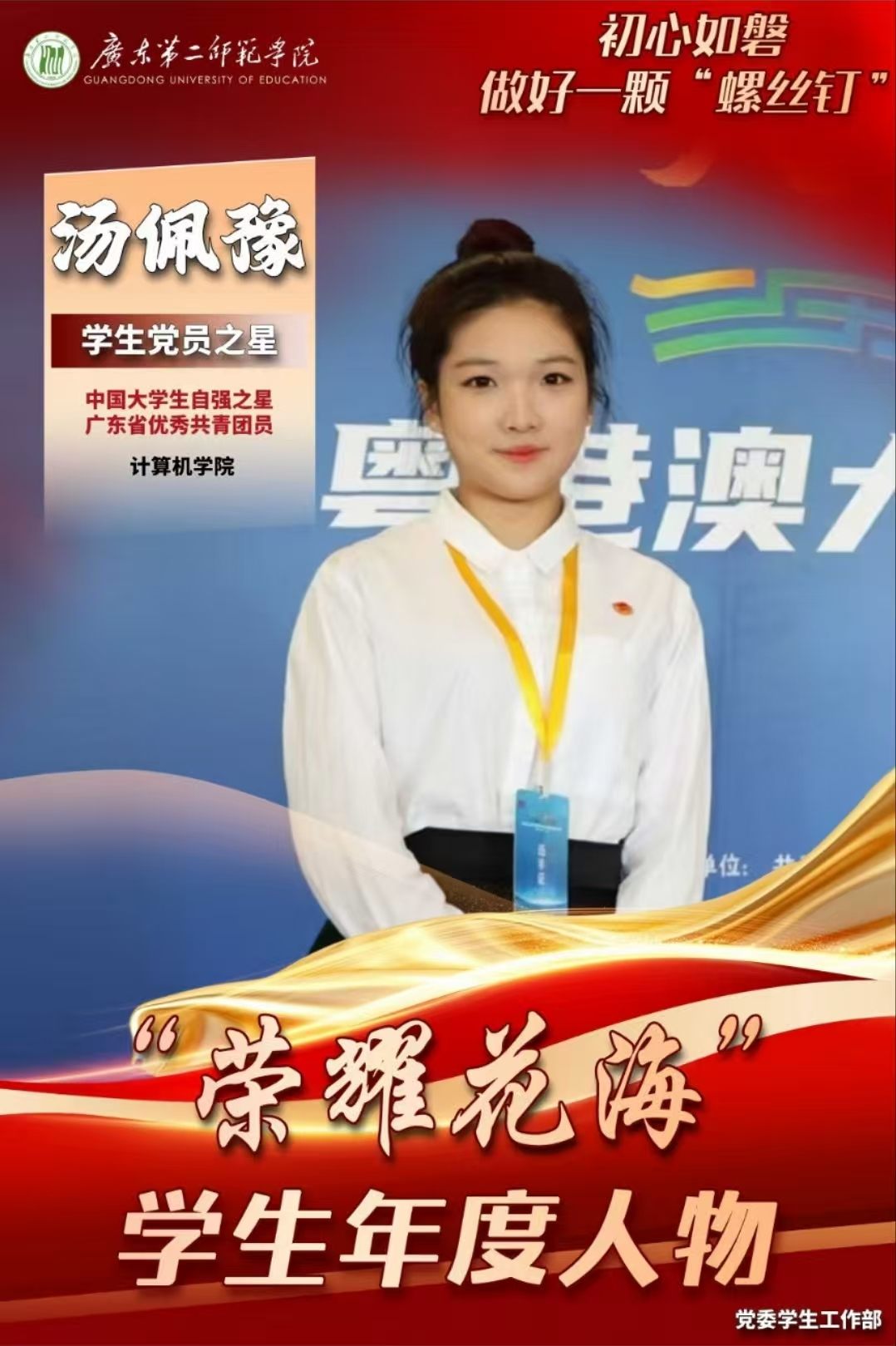 汤佩豫同学坚持德、智、体、美、劳五育全面发展,学习认真刻苦,成绩优异。她执行党的路线、方针、政策,自觉树立和践行社会主义核心价值观,作为计算机学院学生党支部宣传委员,她积极参与党建活动,参与“样板党支部”建设,曾获计算机学院优秀党员、学习强国标兵称号。在校期间,她积极参与科技创新、学科竞赛、志愿服务和社会实践等活动,并取得了突出成绩。