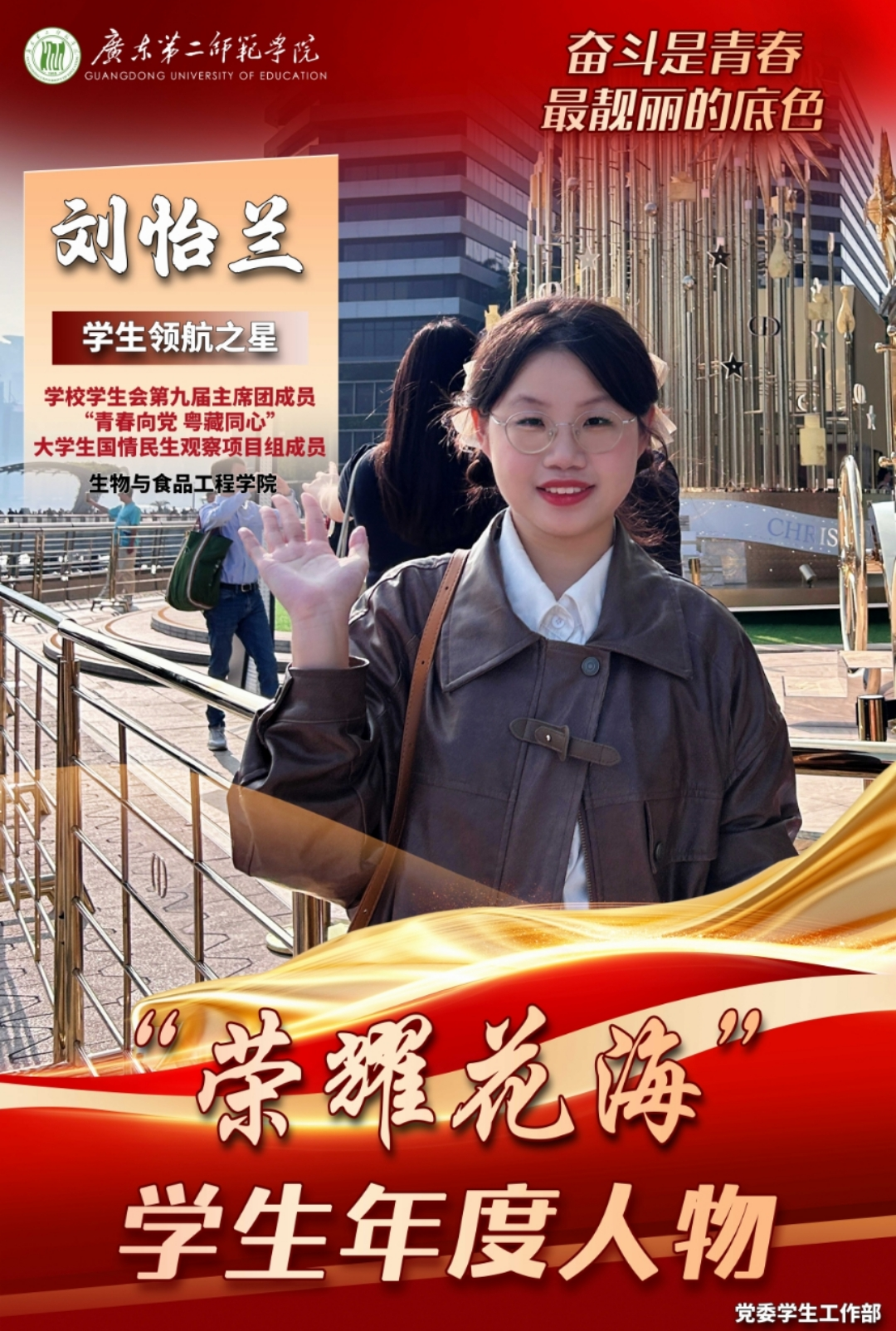 刘怡兰同学“有信仰、讲政治、重品行、守纪律、争先锋”,积极向党组织靠拢。2024年暑假期间,她作为“执梦启航”广东青年大学生“百千万工程”突击队的一员到广东第二师范学院·阳西工作站开展实践调研;同时参与“青春向党 粤藏同心”大学生国情民生观察项目组,前往西藏自治区拉萨、林芝地区开展调研并于2024年9月进行“藏博文化进校园”活动。