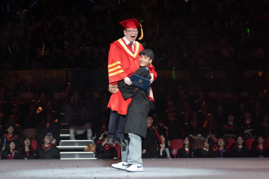 当校歌《想岭南》的旋律响起,全场师生自发合唱,灯光渐次化作星河璀璨的光影矩阵,映照着学子们眼中的不舍与憧憬。随着校歌的余韵渐渐消散,2025届毕业生们纷纷涌向舞台与观众席,与师长紧紧相拥——有人将实训徽章别在导师衣襟上,有人哽咽着说出藏了三年的“谢谢”,更多人用镜头定格这一温暖瞬间。此去经年,岭南追光者们将以各自的姿态散作星河,但属于这个夜晚的感动与力量,终将在时光深处持续闪耀。