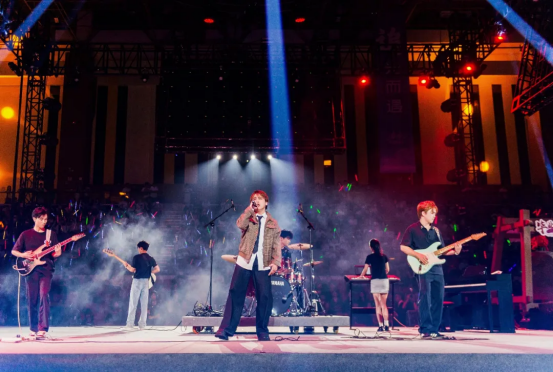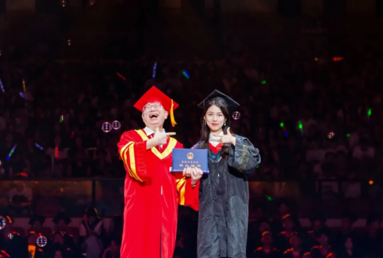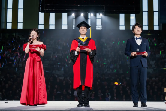刘兴、宾奕聪老师率器乐队学生炸裂演绎摇滚版《就是哪吒》,“我命由我不由天”的嘶吼点燃岭南学子敢闯敢拼的信念;随后二人与张穗怡老师合作《突然好想你》,大屏闪现林荫道、图书馆画面,全场手机灯化作星海,哽咽合唱道尽离别眷恋。毕业生李铜大气磅礴的《天下》,那对理想的呼唤在校园里铿锵回响;终章《光辉岁月》全员合唱,校旗与荧光交织,笑泪中共赴未来。微电影《追光者》重现学子在实习的路上不断闪耀、不断前行,终幕“归来仍是岭南少年”引掌声如潮,为这场满载追光赤诚的典礼写下深情终笔。