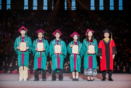 典礼现场,副校长翟树芹宣读《关于准予关兆莹等5277名学生毕业的决定》和《关于授予吴可馨等2350名学生副学士荣誉称号的决定》,字句铿锵,表达了学校对毕业生的庄重嘱托;常务副校长李峻宣读《关于公布2025届优秀毕业生的通知》,表彰在技能竞赛、创新实践等领域表现卓越的学子;党委副书记、纪委书记李浩为2025届校友会年级理事颁发聘书,寄语他们“成为母校与学子间的温暖纽带”;副校长张爱国、徐萍为优秀毕业生代表颁发“优秀毕业生”证书,彰显了对优秀学子在学业发展、实践创新等方面突出表现的高度认可与鼓励。,红色缎带上“卓越追光者”的金字在灯光下熠熠生辉。随后,校长劳汉生为300名毕业生代表逐一颁发毕业证书,毕业生们的激动和喜悦溢于言表。