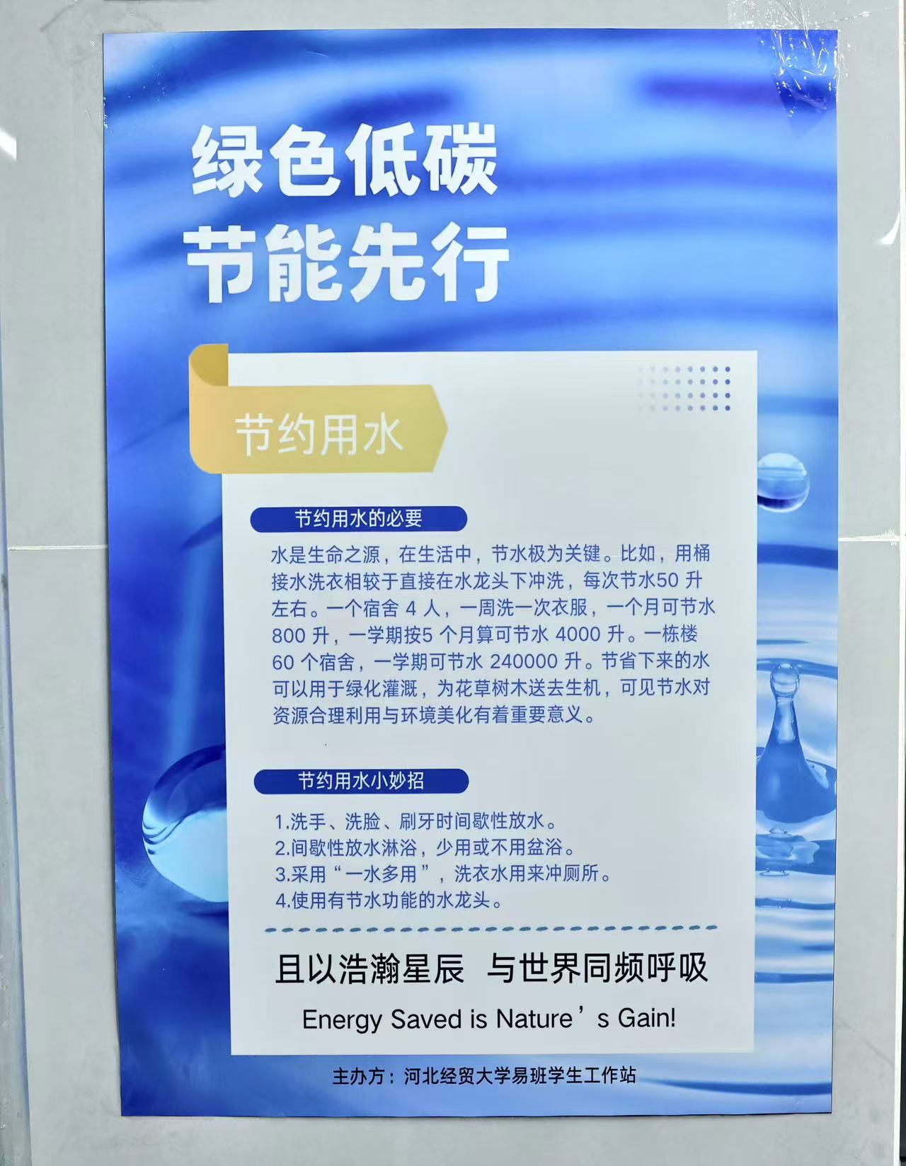 在“一站式”学生社区的建设进程中,此次节水节电活动宛如一颗绿色种子,深植于经贸学子心间。这不仅是一次节能实践,更是一堂生动的思政课,让经贸学子深刻领悟到节约能源与个人责任之间的紧密联系。
