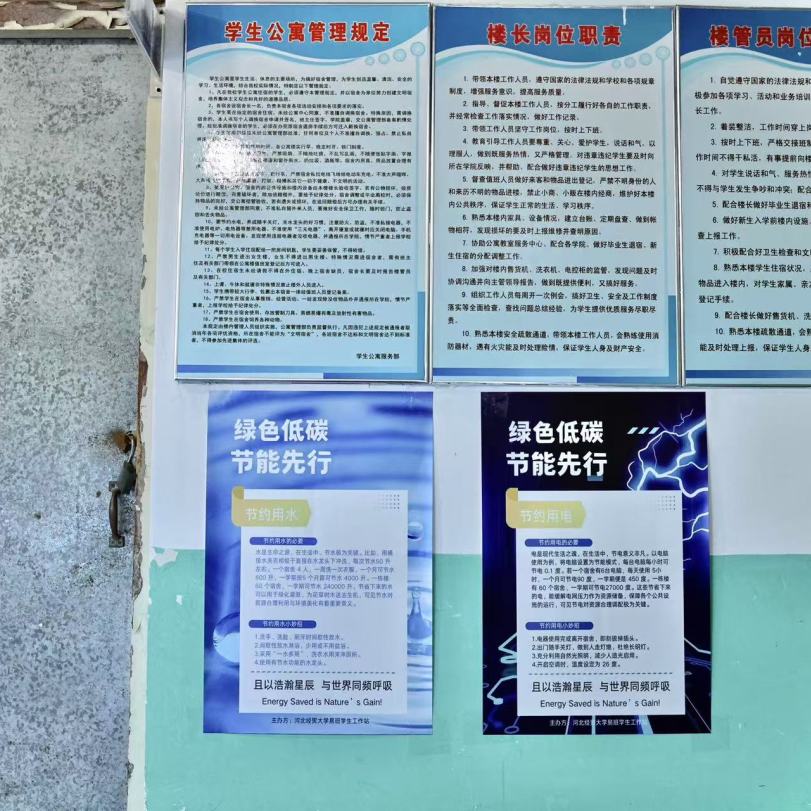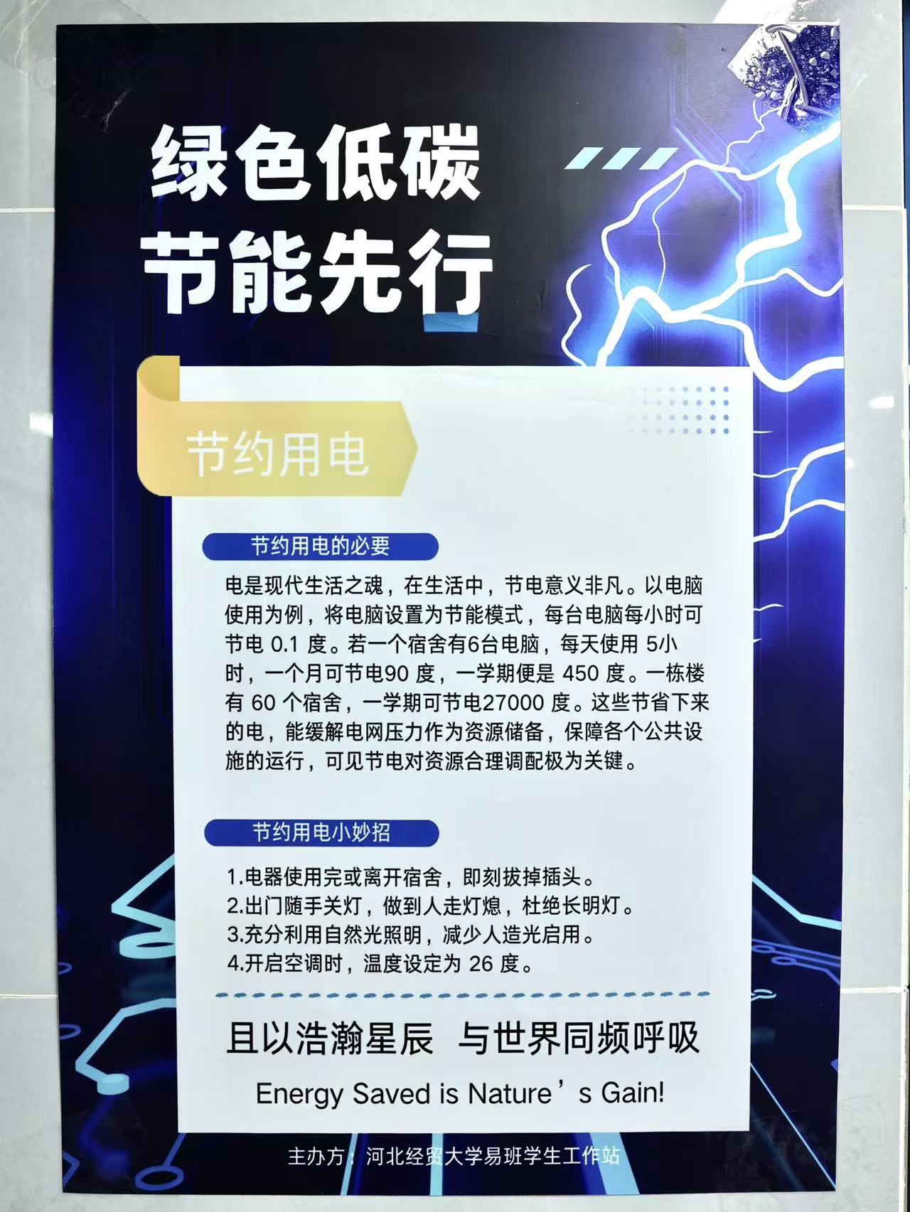 此外,工作站积极推进“一站式”学生社区建设,特别设计并印制了以“绿色低碳,节能先行”为主题的海报。通过在宿舍楼的显眼位置张贴宣传海报,易班工作站希望能将节水节电的理念直接传达给每一位学生,使节约资源成为社区文化的一部分。