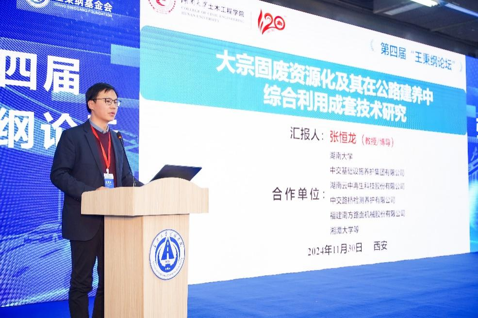 颁奖大会上,张恒龙受邀作题为《大宗固废资源化及其在公路建养中综合利用成套技术研究》的学术报告,系统介绍了项目团队关于建筑固废和道路固废等大宗固废在道路结构中绿色低碳协同利用的成套技术体系,并结合川藏公路G318线提质改造工程和沪昆高速潭邵段大修改造工程等典型工程,介绍了研究成果在全国多省市规模化应用情况。