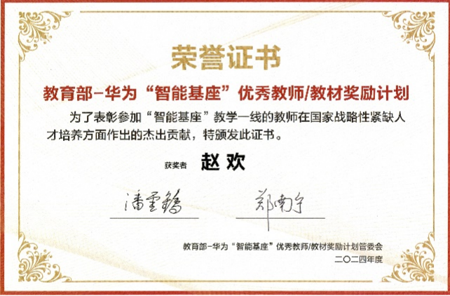 赵欢教授获得华为“智能基座”优秀教师/教材奖励计划