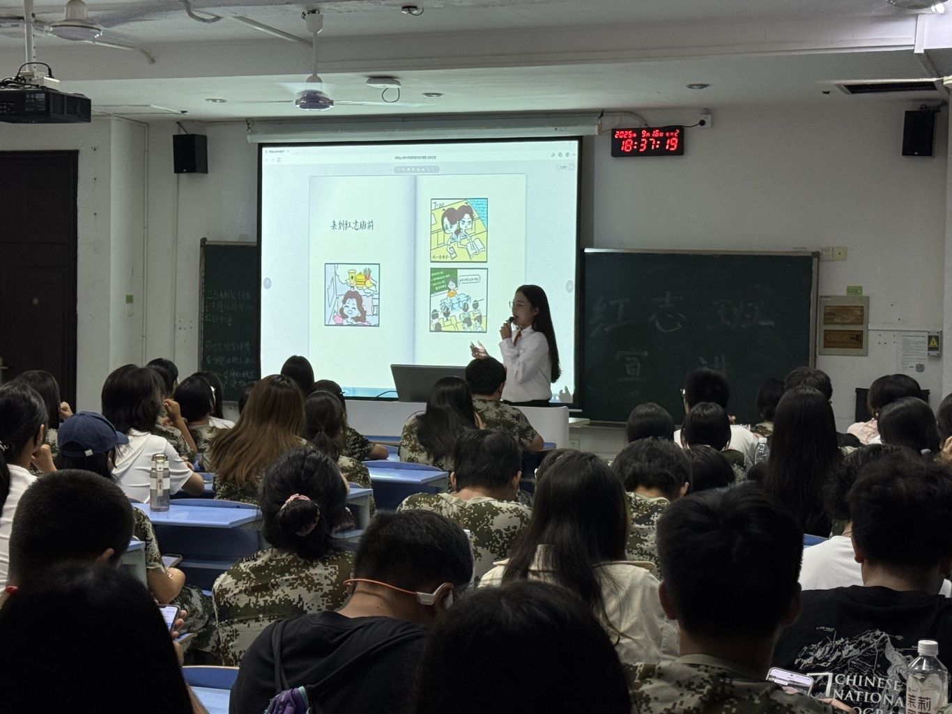 随后,宣讲团成员展示原创手绘漫画红志之绘,将宣讲推向高潮。红志之绘既是红色励志班的“精华集锦”,也是红色知识的“移动课堂”,生动呈现了红志生活的成长印记和精神滋养。同时,宣讲团成员结合自身真实经历,为同学们讲述了自己在红色励志班完成的四大蜕变:学习状态从松散到自律的蜕变;红色记忆从模糊到清晰的唤醒;信仰根基从薄弱到牢固的筑牢;精神世界从迷茫到坚定的跨越,让同学们更加深刻地认识到了红色励志班的独特魅力。