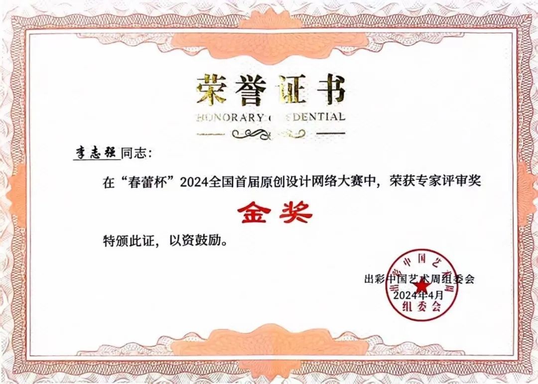 2024年4月,李志强老师创作的作品《梦回80年代-定格童年回忆》荣获春蕾杯全国首届原创设计网络大赛金奖,因成绩优异被授予“全国十大设计师”称号。5月25日,李志强受邀参加了在北京央视星光演播厅举办的“感动中国2024综艺盛典”颁奖典礼并现场进行了设计分享。