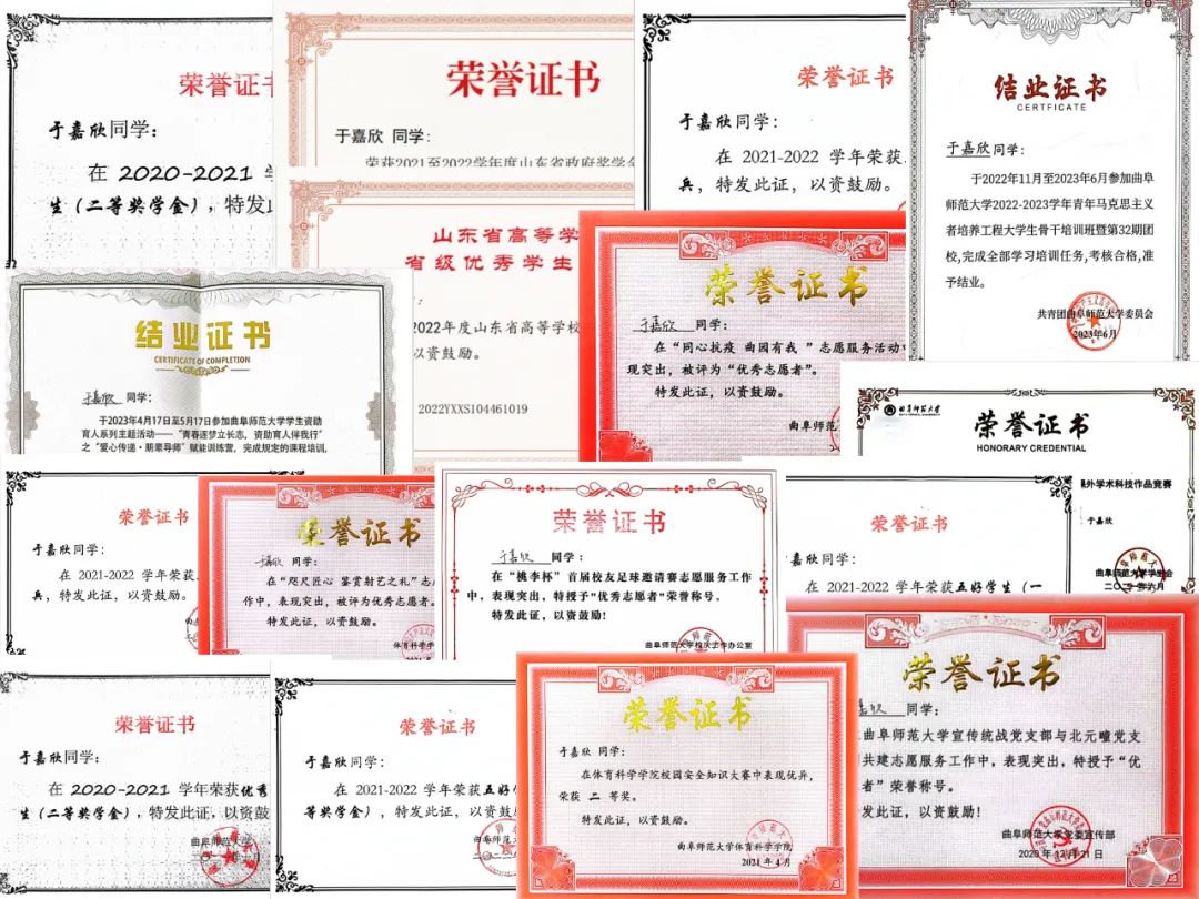 02图为于嘉欣所获荣誉 曲阜师范大学提供