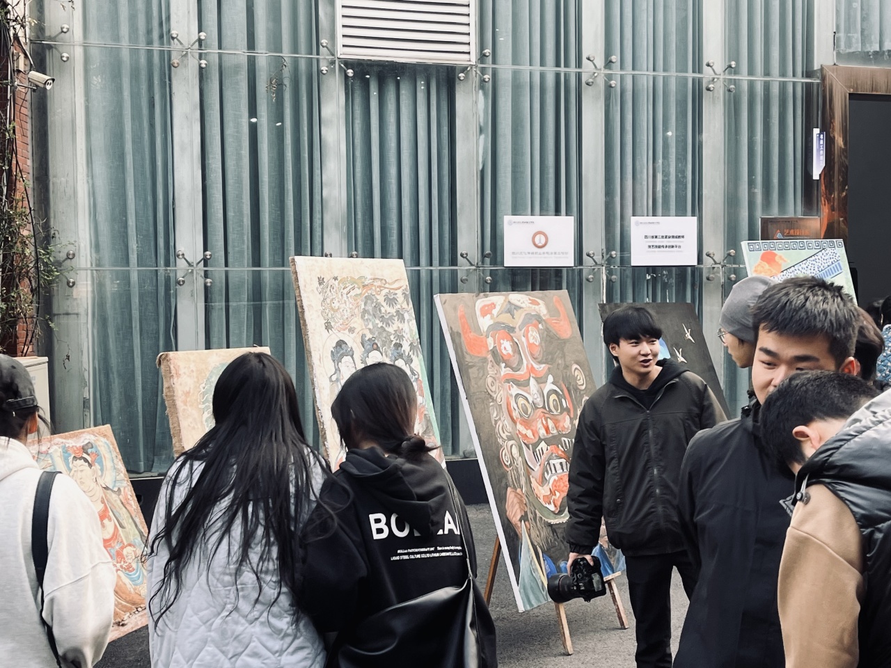 美术教研室主任张岩老师介绍到:“展览充分的体现了以人为主体因材施教的教学理念,根据每位同学的不同特点和所擅长的美术领域进行创作。同时,在创作构思最初就将内容与主题融入“思政元素”,把中国传统文化技艺掐丝画、岩彩画、泥板画等创作手法和四川地区特有的民族文化元素符号相结合,以多变的硬边和虚而活泼的墨色对比,演绎出的一种空幻视觉印象,也尝试将不同的材料媒介之间相互联系产生新的艺术效果。通过多种材料、不同形式的方式为同学们在今后的教学工作岗位专业教学、教研、创作打下一定坚实的造型基础。”