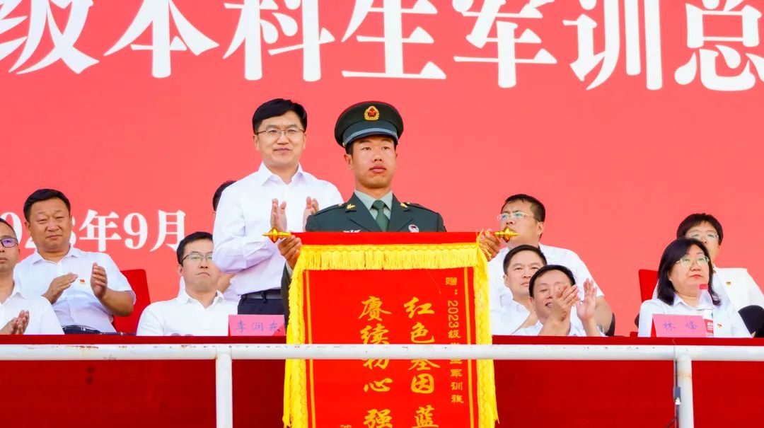 党委学生工作部部长、学生处处长、武装部副部长王迪宣布2023级本科生军训总结表彰大会到此结束。