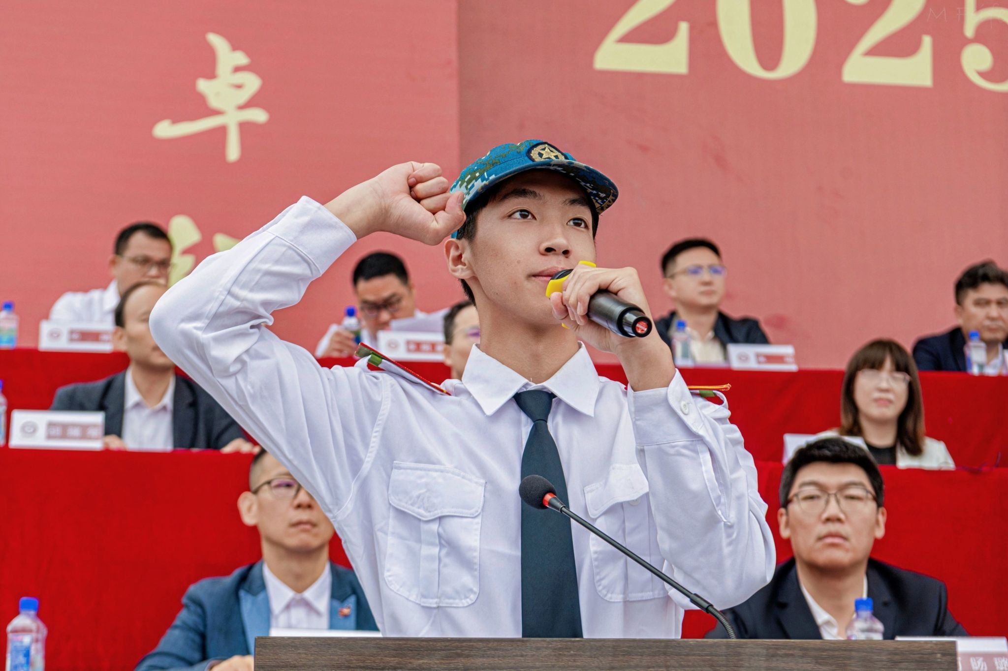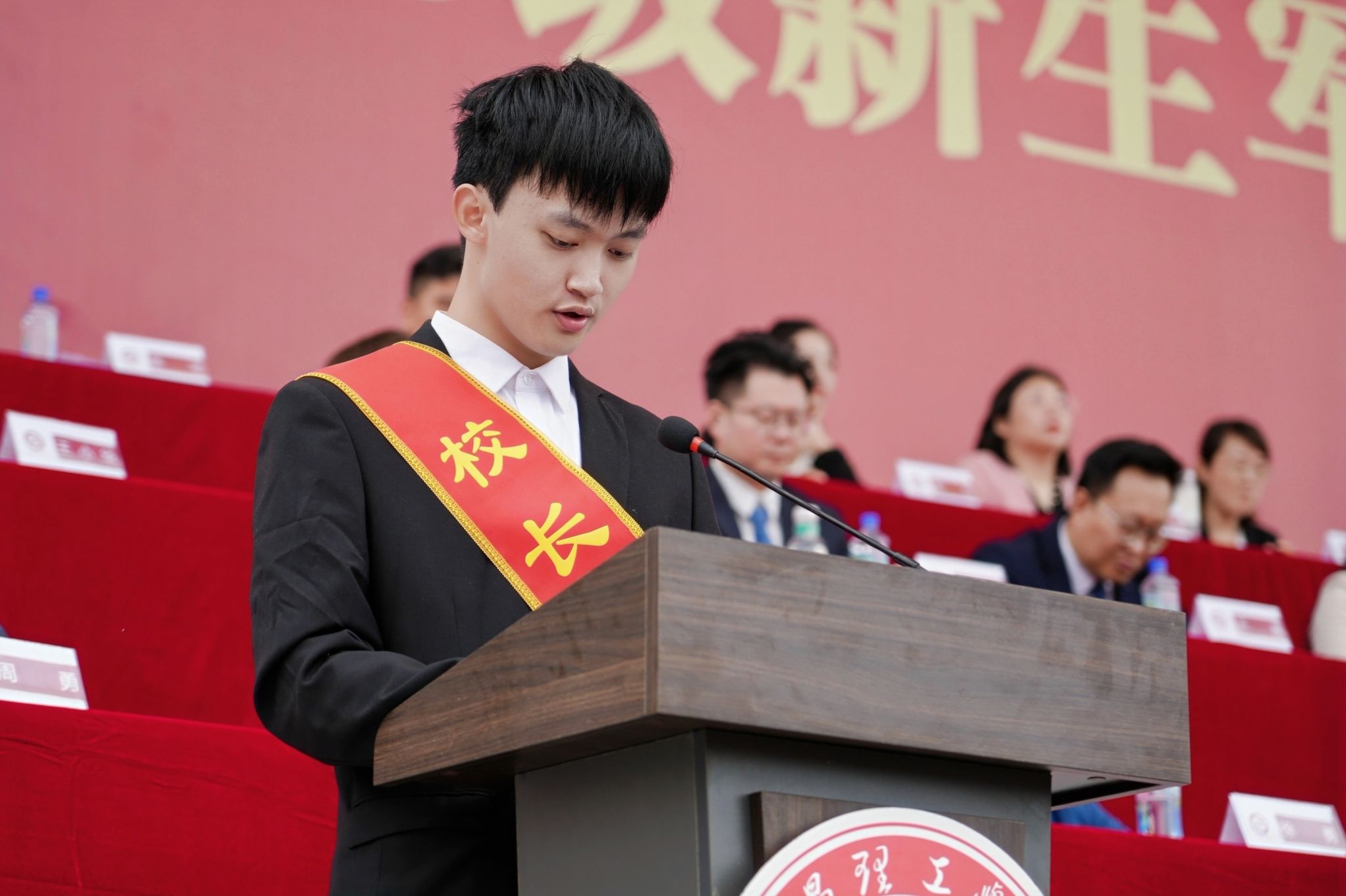 “我们将恪守校训,追求卓越,走向成功;请党放心,强国有我!”活动最后,新生代表崔竣皓带领全体2025级新生庄严宣誓,铿锵誓言回荡在运动场上空。2025级新生军训检阅式暨开学典礼在激昂的《中国人民解放军军歌》与热烈掌声中圆满落下帷幕。(完)