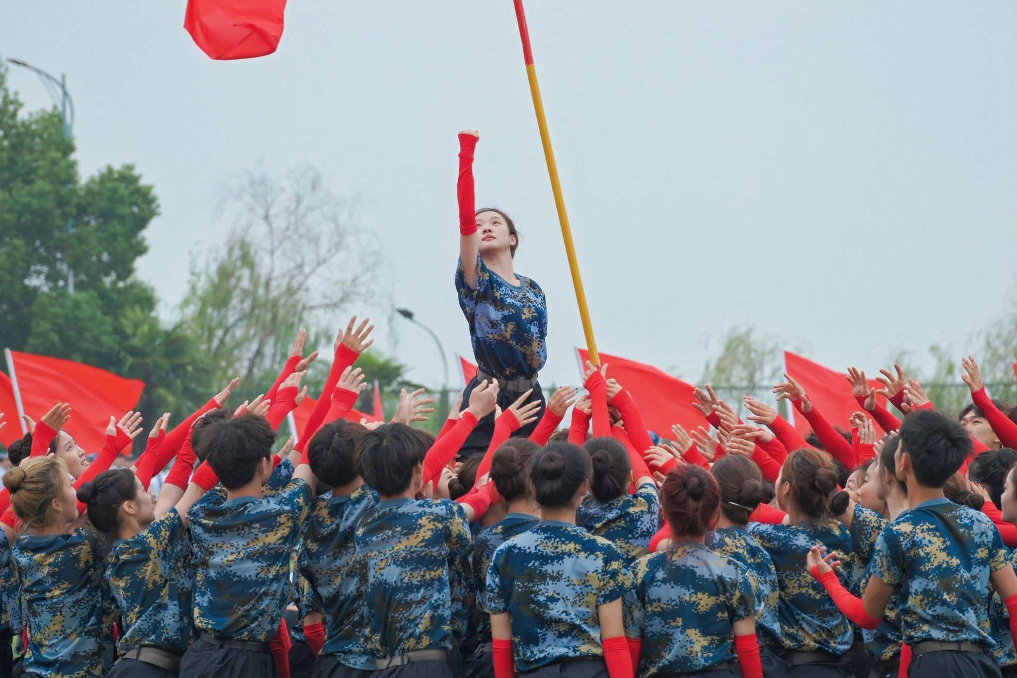 应急棍方阵的新生身着迷彩作训服,手持应急棍列阵,“横劈”“竖挡”“斜刺”动作整齐划一,打出了新生们的精气神。1300余名新生组成的方阵先后化作歼-20战机、东风-61导弹图案致敬大国重器。由智能建造学院、影视传媒学院、人工智能学院等学院组成的30多个方阵队伍昂首挺胸,迈着坚定有力的步伐经过主席台。“智能赋能建造,实干铸就强国根基”“巾帼不让须眉,传媒勇立潮头”等口号响亮有力,动作标准规范,将军训14天的汗水与坚持,化作最动人的青春答卷。