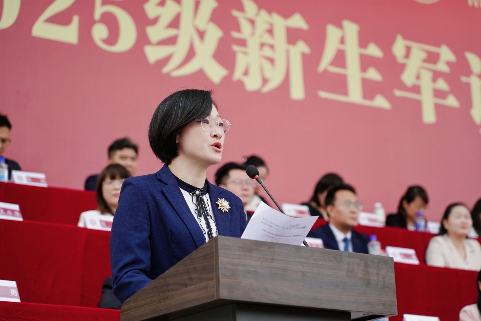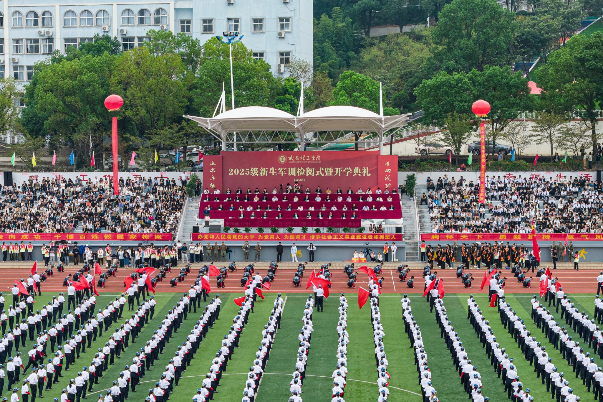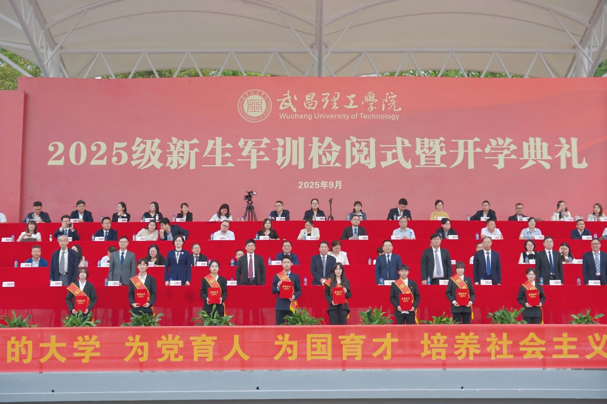 在激昂的国歌声中,活动正式拉开帷幕,参会人员全体起立,对着冉冉升起的五星红旗行注目礼。迎军旗后,校党委书记高建勋对2025级新生军训方队进行检阅,“同学们好,同学们辛苦了!”“书记好!为校争光!”嘹亮的口号铿锵有力、气势磅礴。