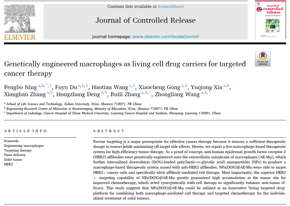 近日,西安电子科技大学生命科学技术学院王忠良教授团队宁蓬勃副教授基于巨噬细胞卓越的肿瘤趋向性和深度浸润特性,设计一种基于基因编辑工程化巨噬细胞构建“活细胞”载药体系的高效治疗实体肿瘤新方法,研发一种以工程化巨噬细胞作为载体的“活药”递送平台,这一成果发表在医学TOP期刊《Journal of Controlled Release》(影响因子:10.8)上,题为“Genetically engineered macrophages as living cell drug carriers for targeted cancer therapy”,文章的唯一通讯单位为西安电子科技大学,通讯作者为宁蓬勃副教授、张瑞丽副教授和王忠良教授。
