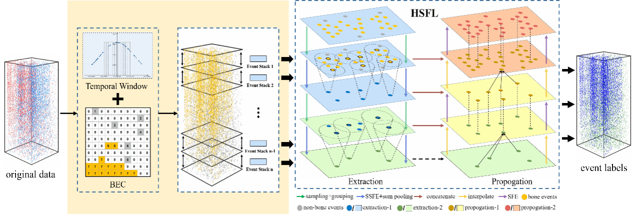 然而由于差分成像系统信号触发特性,事件流数据伴随着大量噪声,限制了事件相机的发展。现有深度学习的事件去噪方法大多存在可解释性差和实时处理困难的问题。本文提出了一种基于窗口的事件去噪方法,同时处理窗口内所有事件,大大提升了去噪速度。此外,本文构建了一个新的基于多尺度窗口的事件去噪网络WedNet,并基于时间和空间域的概率分布进行了理论分析。在时间域中,我们使用时间窗(TW)模块来判断时间相关性以过滤出时间无关的事件。在空间域中,我们选择最大后验概率(MAP)来区分真实世界的事件和噪声,并使用学习到的卷积稀疏编码来优化目标函数,构建了软阈值空间特征嵌入(SSFE)模块。