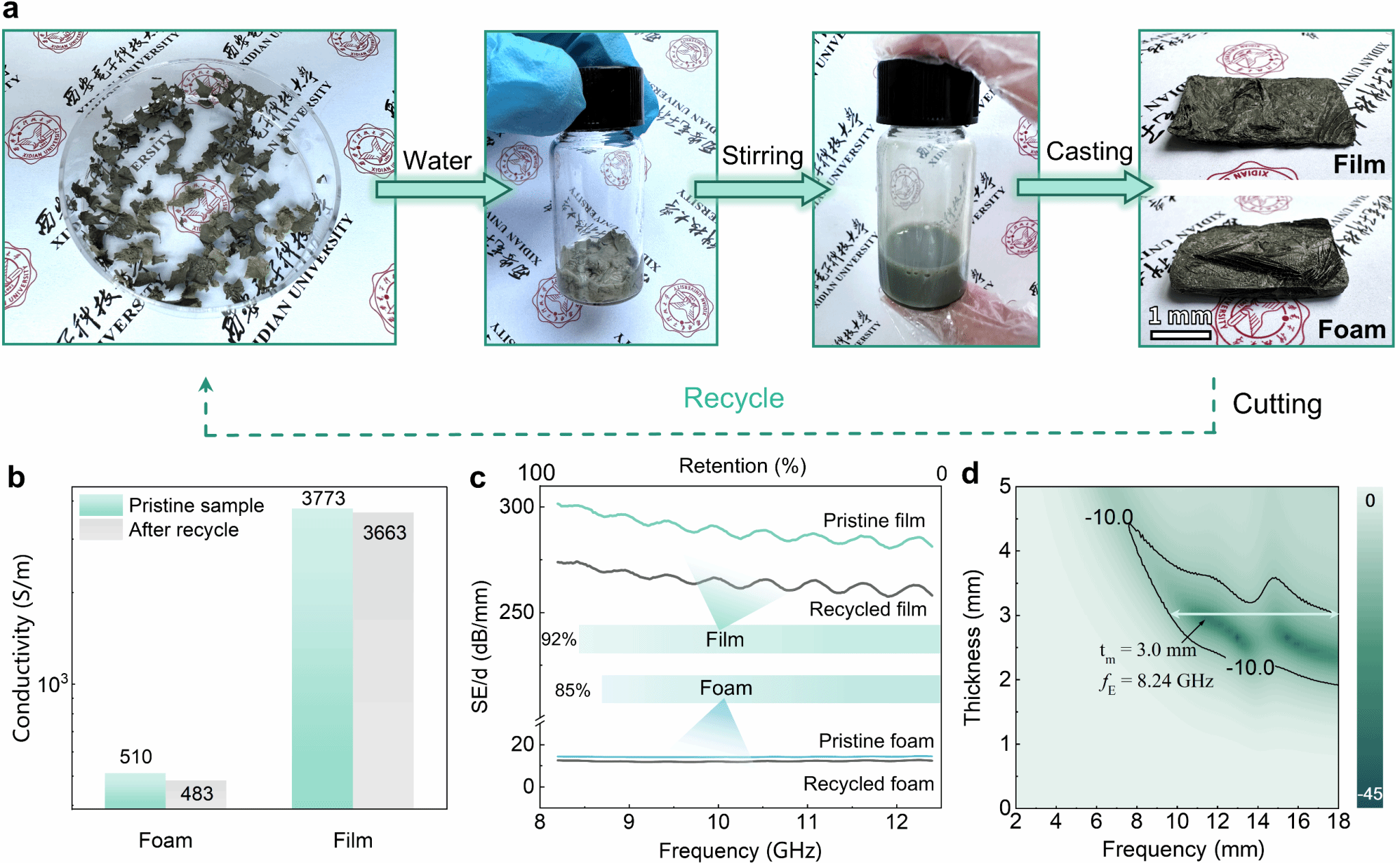 进一步,研究团队通过常温机械搅拌将废弃的副产物气凝胶重新分解为均匀的纤维素-副产物浆料,使其作为二次回收材料实现循环加工利用。基于纤维素与聚乙烯吡咯烷酮之间通过范德华力、氢键和静电相互作用形成的弱物理交联作用,气凝胶展现出优异可回收性——其纳米导电网络整体保持完整,导电性与电磁功能基本维持初始水平,为绿色电磁功能材料“闭环式”循环体系的构建提供了新思路。
