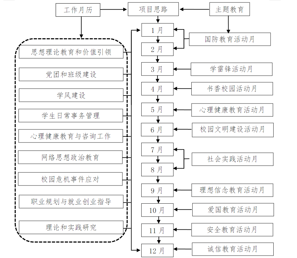 把大学生思想政治教育设置成十个教育主题模块,每月(寒暑假各一个)落实一个思想政治教育主题,立足大学生特点和实际需求,以班会、校园文化活动、微信公众平台等为载体,为学生提供系统性、连续性、长效性的思想政治教育。通过十项主题教育,提高学生思想水平,将思想政治教育工作落实做细。