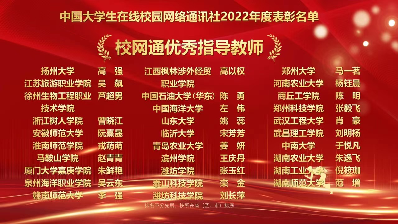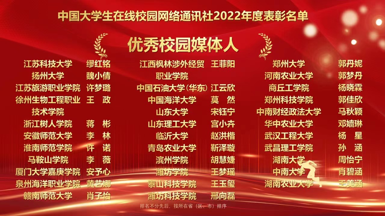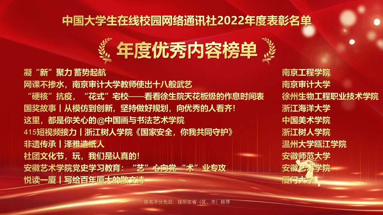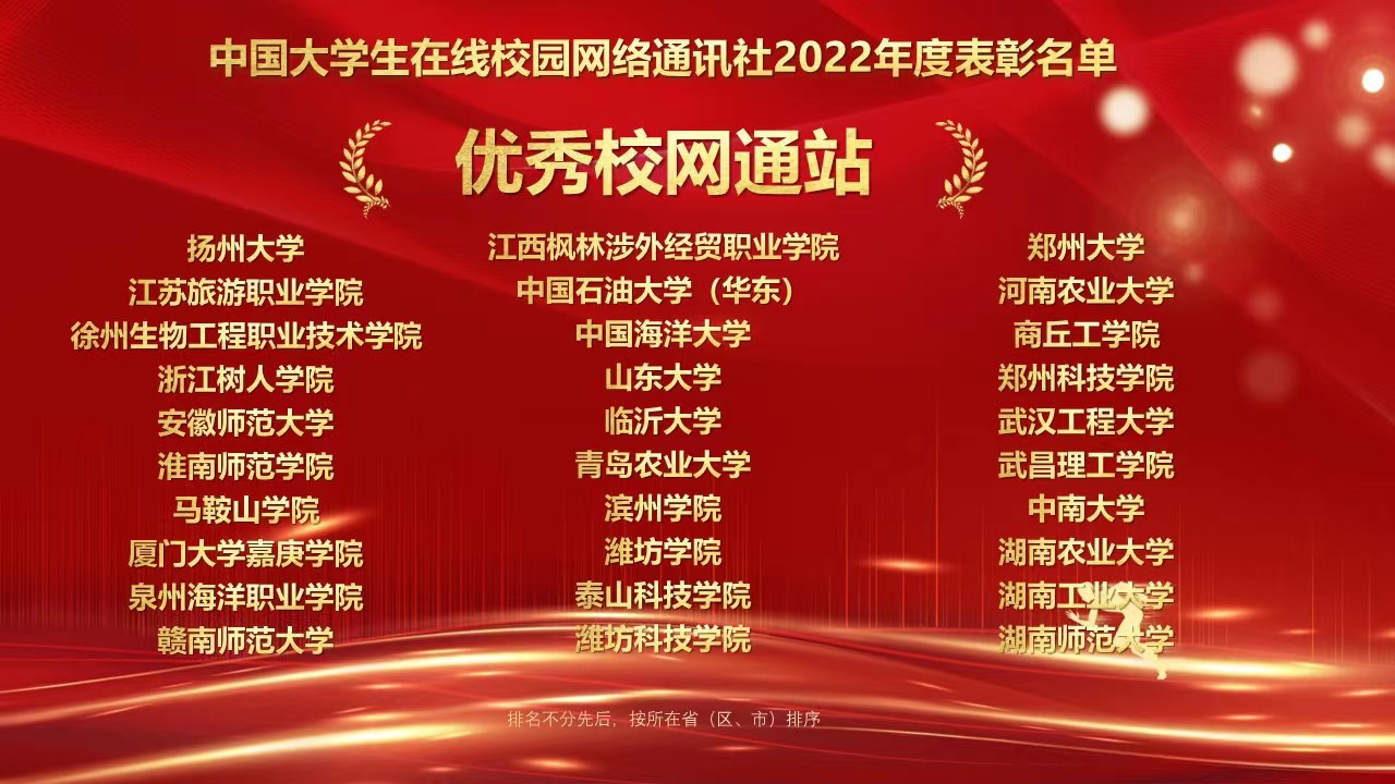 我校新闻中心校园网络通讯站从全国663所设立了大学生校园网络通讯站的高校脱颖而出,荣获全国“2022年优秀校园网络通讯站”,党委宣传部芦超男老师获得“校园网络通讯站优秀指导教师”,校园网络通讯站王政同学荣获“优秀校园媒体人”,由农林工程学院原创供稿的新媒体作品《“硬核”抗疫,“花式”宅校——看看徐生院天花板级别的作息时间表》获得“年度优秀内容”。中国大学生在线由教育部主办,是国内最大的面向全国大学生开展思政工作的主题教育网站,工作覆盖全国3000所高校,获奖实属不易!