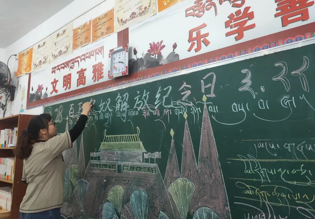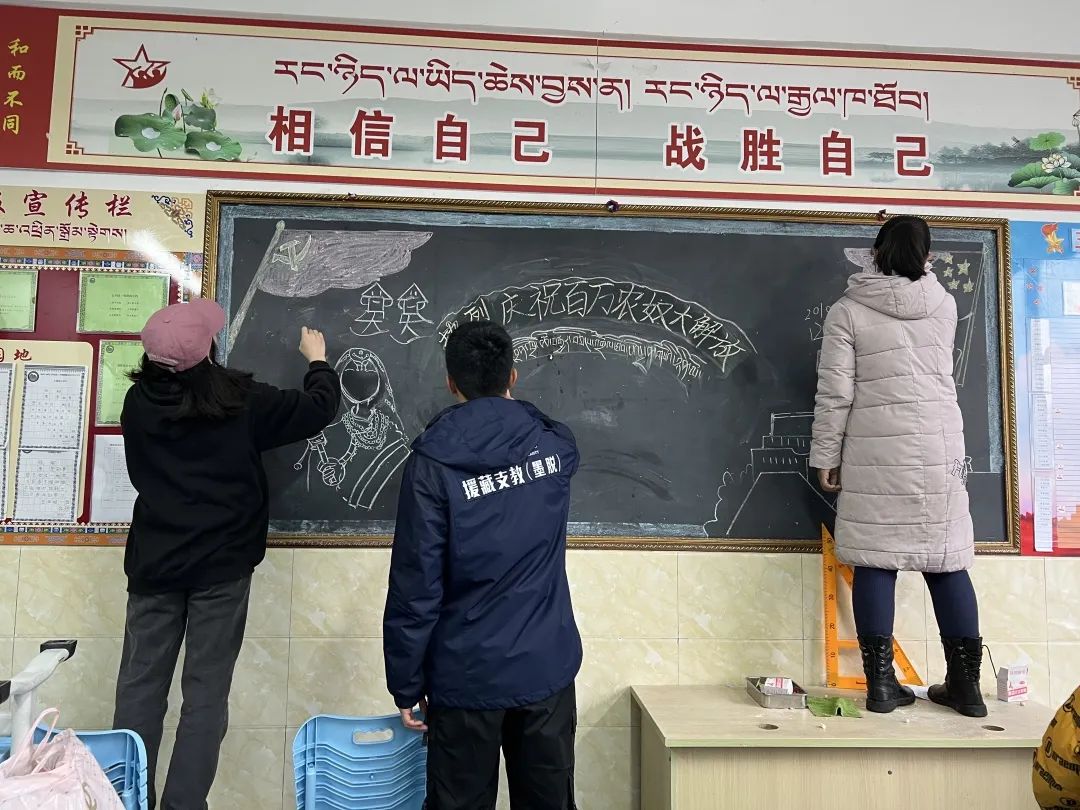 作为小学普及性教育的宣传阵地,黑板报的绘制是“3.28”纪念活动必不可少的形式。队员林宁、刘沛明以及梁文婷通过粉笔字、图画的方式向学生们介绍百万农奴解放纪念日的历史事迹,让学生们回望那段艰辛的历史,牢记在党的领导下西藏才实现了“旧貌换新颜”。