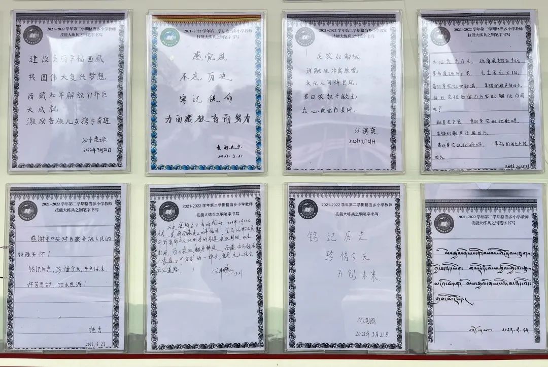 文字发展源远流长,在西藏地区,藏文与汉字是老师们日常教学的两大主体方式。作为格当乡小学的支教老师,丘梓鹏和何鸿鹏积极参与学校教师特色技能展示活动,以“3.28百万农奴解放纪念日”为主题,以硬笔书法的形式参与到纪念日活动中来,用一笔一划书写革命先辈的历史功绩。在此次的特色技能展示中,藏文与汉字同时出现在了学校的宣传栏内。